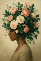 Een dromerig portret waarin het hoofd van een vrouw uitbloeit tot een weelderig boeket van pastelrozen en groen blad. Dit kunstwerk ademt rust, natuur en innerlijke schoonheid in een subtiele schilderstijl.