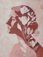 Een minimalistisch maar krachtig vrouwenprofiel, verweven met bloeiende bloemen die symbool staan voor innerlijke groei en verbondenheid met de natuur. De zachte aardetinten en textuurrijke penseelstreken geven dit portret een serene en tijdloze uitstraling.