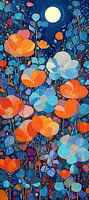 Bloemen vrolijk - Op dit bloemen schilderij zie je kleurrijke bloemen in oranje en blauw, tegen een donkere achtergrond met een heldere maan, wat een vrolijke en moderne uitstraling geeft aan de kunst.