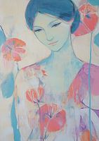 Details: vrouwen schilderij, bloemen schilderij, meditatief schilderij, moderne kunst, gebruik van kleur, roze, oranje, blauw,…