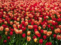 een zee aan tulpen in een veld . mooie gemengde kleur rood met roze. Heel scherm vol met tulpen.