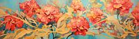 Bloemen - Het canvas is gevuld met een levendige uitbeelding van rood-oranje bloemen, die dansen op een achtergrond van fris turquoise. De stijl is modern met een aanstekelijke dynamiek in de bloemblaadjes en een sterk gevoel voor beweging en toon in de overlappende bladeren, wat een rijke diepte creëert.