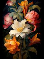 Dit werk met bloemen straalt een weelderige en levendige energie uit, waarbij de bloemblaadjes in volle bloei lijken te staan. De heldere kleuren en subtiele schakeringen brengen de schoonheid van de natuur op een speelse manier tot leven. Elk detail van de bloembladen, van hun textuur tot hun stralende tinten, draagt bij aan een frisse en uitnodigende uitstraling die de ruimte opfleurt.