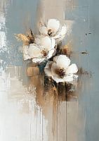 Bloemen - Dit bloemen schilderij toont een reeks grote, opvallende witte bloemen met gouden en bruine accenten op een gespikkelde grijze achtergrond, waarbij de textuur en de dikke verflagen een levendige dynamiek creëren.