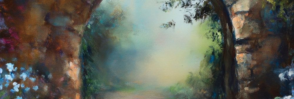 Een magische doorgang van verweerde steen opent het zicht op een betoverend landschap, omlijst door bloeiende planten in felle kleuren. De zachte gloed van het licht achter de poort belooft avontuur en ontspanning in een wereld vol kleuren en geuren. De harmonie van de natuur betovert de kijker en wekt een verlangen naar onontdekte paden.