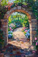 Een schilderachtige tuin wacht op bezoekers achter een betoverende stenen boog, versierd met kleurrijke bloemen en weelderig groen. Het zacht gebogen pad nodigt je uit om je onder te dompelen in de levendige kleurenpracht, terwijl de geur van lentebloemen de lucht vult en de zintuigen betovert. Hier lijkt de tijd stil te staan en schittert natuurlijke schoonheid in al haar pracht.