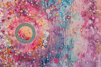 Abstracte kleurrijke verbeelding van natuurlijke schoonheid. Een harmonie in diverse kleuren spelend met het licht. Bloemen verbeeld in cirkels in stippen dansen op de afbeelding. Kleurstelling is roze, blauw, aquablauw, geel. oranje en paars. Daarnaast een opvallende ring. Passend bij diverse stijlen en trends, waaronder Ibiza, zomer, lente, bloemenpracht, bloemenveld, spiritueel en mindfulness. Artist: Bianca ter Riet
