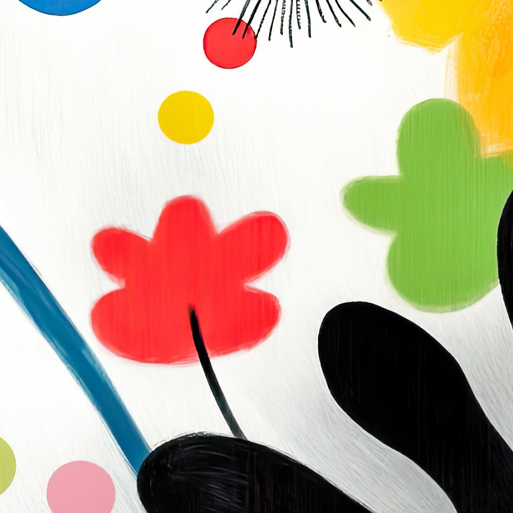 Dit schilderij combineert dynamische vormen en heldere kleuren die de levendigheid van bloemen en de lichtheid van de natuur weerspiegelen. De abstracte bloemmotieven en organische vormen geven het een speels tintje en nodigen uit om te dromen. Met een harmonieus samenspel van levendige roodtinten, zonnig geel en rustgevend blauw is dit schilderij een absolute blikvanger in elk modern huis. Ideaal voor woonkamers, kantoren of creatieve ruimtes.