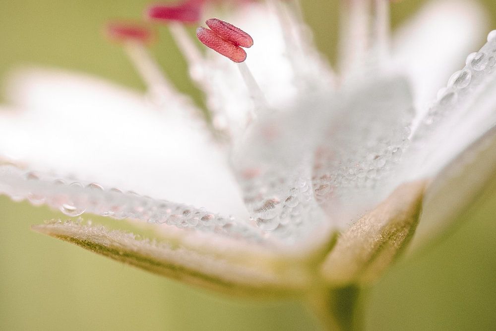 Een close-up van een klein bloemetje (naam onbekend) waarop de meeldraden en dauwdruppels goed zichtbaar zijn.