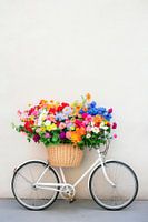 Een stralende caleidoscoop van kleuren ontvouwt zich in een rustieke mand op een nostalgische witte fiets. De bloemenpracht ademt een vrolijke sfeer uit en nodigt je uit om het leven van alledag achter je te laten en je onder te dompelen in een bloeiende droomwereld. Een betoverend symbool van levensvreugde en creativiteit!