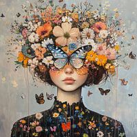 Bloemengezicht | Kleurrijke Bloemen en Vlinders - Op dit bloemen schilderij zie je een jonge vrouw wiens hoofd en schouders bedekt zijn met een weelderige verzameling kleurrijke bloemen en vlinders, wat een levendig en fantasierijk portret creëert.