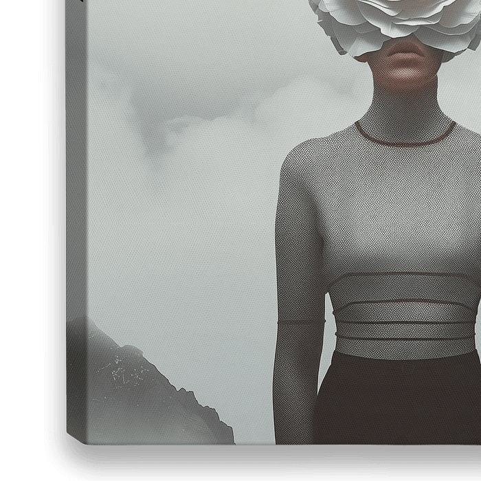 Een abstracte poster van een vrouw in grijze kleding die buiten staat. De bovenkant van haar gezicht wordt bedekt door een witte bloem.