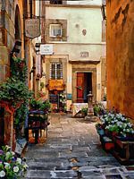We kijken door een charmant steegje met flagstones, langs de uitstalling van petunia's en het karretje met bloempotten, naar een halfopen oude houten deur met een tafel en…