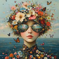 Bloemenhoofd | Vrouw met Bloemen - Op dit vrouwen schilderij zie je een jonge vrouw versierd met een overvloed aan kleurrijke bloemen op haar hoofd en vlinders die om haar heen fladderen, waarbij haar bril spiegelt met uitgestrekte zee en lucht.