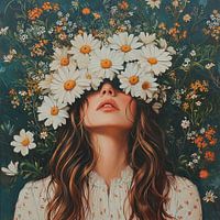 Bloemenkrans | Gezicht Bedekt Bloemen Vrouw - In dit bloemenschilderij zie je een vrouw wiens gezicht volledig bedekt is met een krans van witte margrieten tegen een achtergrond van weelderige, veelkleurige bloemen.