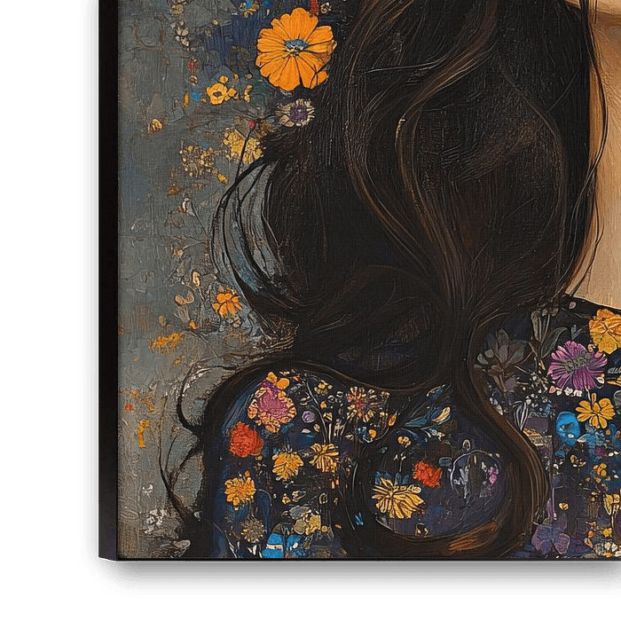 Bloemenkrans | Kleurrijk Bloemenportret - Op dit vrouwen schilderij zie je een jonge vrouw met gesloten ogen, omringd door een levendige bloemenkrans die haar hoofd en schouders bedekt, tegen een donkere achtergrond die het kleurrijke bloemmotief benadrukt.