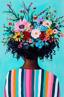 Met een bedwelmende bloemenzee die de weelderige krullen siert, straalt deze illustratie levensvreugde en creativiteit uit. De levendige kleuren en het intrigerende contrast tussen de kleurrijke lijnmode en de zachte achtergrond toveren elke kamer om tot een oase van inspiratie. Ideaal voor de woonkamer, waar het hart van het huis klopt.