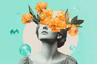 Hier ontvouwt zich een magische symbiose van mens en natuur. Gouden bloemenkransen omringen zachtjes het gezicht van een elegante figuur, terwijl luchtbelletjes lichtjes om haar heen dansen. De mintgroene achtergrond versterkt de levendigheid van de scène en creëert een dromerige sfeer die de kijker uitnodigt om te blijven hangen en…