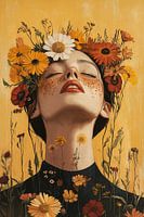 Deze digitale illustratie combineert hyperrealisme met surrealistische elementen in een betoverend portret. Een vrouw met gesloten ogen en opgeheven gezicht wordt omringd door een weelderige bloemenkrans in warme herfsttinten. De textuur en de bloemen geven een hint van realisme en detail, terwijl de surrealistische compositie een…