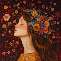 Bloemenkroon | Bloemen Vrouw - Op dit vrouwengezicht schilderij zie je een jonge vrouw met gesloten ogen, omringd door een weelderige verzameling kleurrijke bloemen die als een levendige kroon om haar hoofd zijn gerangschikt, tegen een diep rode achtergrond.