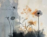Bloemenkunst - Dit bloemen schilderij toont een collectie van gestileerde silhouetachtige bloemen en bladeren in een serene, gelaagde compositie waar zwart, grijs, en oranje tinten domineren tegen een subtiel structuurrijke achtergrond, die een kalme en contemplatieve sfeer uitstraalt.