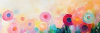 Bloemenkunst - Dit abstracte schilderij toont een verzameling levendige, gestileerde bloemen in uiteenlopende kleuren zoals roze, rood en blauw, die uit een impressionistisch geschilderde achtergrond van zachte gele en groene tinten omhoog lijken te komen.