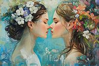 Bloemenkus | Lieflijke Ontmoeting met Bloemen - Dit vrouwen schilderij toont twee vrouwen gezichten dicht bij elkaar, versierd met levendige bloemenkransen, tegen een gelaagde, textuurrijke achtergrond in waterverfstijl met tinten blauw en groen.