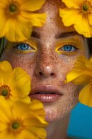 De foto toont een fascinerend portret van een persoon, omlijst door felgele bloemen. De helderblauwe ogen en het frisse, sproeterige gezicht springen er indrukwekkend uit. Gele accenten in de oogmake-up versterken de levendige kleurenharmonie, terwijl de zachte lippen een natuurlijke schoonheid uitstralen. Een harmonieus samenspel van…