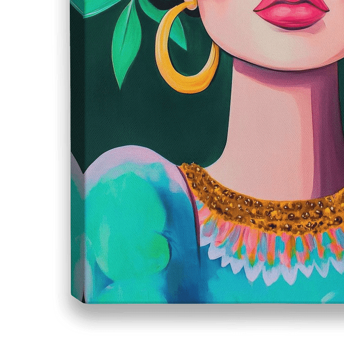 De afbeelding toont een expressieve vrouw met gesloten ogen, omlijst door weelderige bloemen en groene bladeren. Haar felle lippen en sierlijke ketting vallen op, terwijl de zachte kleuren en fantasierijke stijl een gevoel van harmonie en innerlijke rust uitstralen. De combinatie van natuur en kunst creëert een magische sfeer.