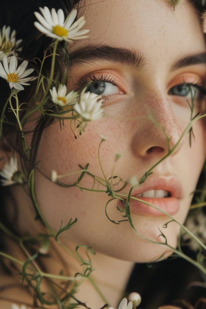 De foto toont een jonge vrouw met wild, krullend haar, kunstig versierd met delicate bloemen en groene ranken. Haar heldere ogen en zachte sproeten geven haar een natuurlijke schoonheid. Het contrast tussen het donkere, kanten topje en de lichtgekleurde bloemen creëert een harmonieuze, dromerige sfeer die doet denken aan de lente.