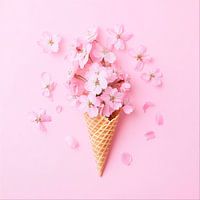 Een delicaat vleugje lente wordt gecombineerd met een onweerstaanbare traktatie: een wafel vol bloeiende kersenbloesems verspreidt vreugde en kleur. De zachtroze tinten harmoniëren perfect met de pastelkleurige achtergrond, terwijl tere bloemblaadjes als confetti rond het ijs dansen en de zintuigen betoveren. Een zoete droom die natuur en plezier combineert.