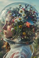De afbeelding toont een persoon in een transparant ruimtepak wiens helm is versierd met prachtige bloemen. Deze levendige, kleurrijke bloemen stralen levensvreugde uit en contrasteren met de kalme, peinzende houding van de persoon. Het zachte licht versterkt de dromerige sfeer en brengt een harmonieuze overeenstemming tussen mens en…