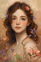 Een warm, dromerig portret van een jong meisje, omringd door delicate bloemenelementen. Een foto vol zachtheid en emotie.
