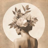 Een delicaat silhouet, omlijst door weelderige bloemdecoraties, straalt een tijdloze elegantie uit. De zachte contouren van de achterkant harmoniëren perfect met het stralende, ronde licht dat eruitziet als een gloeiende maan. De combinatie van bloemen en bladeren verleent het beeld een poëtische gratie en doet de grenzen tussen mens en natuur vervagen.