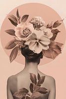Een harmonieuze combinatie van mens en natuur ontvouwt zich in zachte aardetinten. Weelderige bloemen sieren het hoofd, terwijl de delicate bladeren over de rug glijden. Op de achtergrond straalt een delicate, ronde toets die de mystieke uitstraling benadrukt. Deze afbeelding roept rust en natuurlijke schoonheid op, alsof de persoonlijkheid samensmelt met de bloemenpracht.