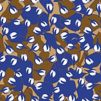 Moderne botanische kunst geïnspireerd op vintage Nederlands textiel - sitsen. Prachtige semi-abstracte bloemmotieven in een retro geïnspireerd kleurenpalet. Naadloze herhaling - kan worden gebruikt als behang of stof. Grafische collage van bloemknoppen, vormen en bladeren. Romantisch, Boheems, Retro, Eclectisch, Nieuw Landelijk, Scandinavische woonstijl.