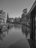 De Bloemenmarkt in Amsterdam gezien vanaf de brug van het Koningsplein. Over het water van de Singel is op de achtergrond de Munttoren te zien.