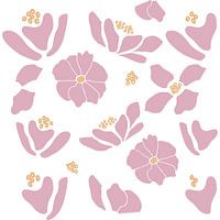 Eenvoudige semi-abstracte bloemmotieven in retro geïnspireerd kleurenpalet. Grafische collage van bloemvormen. Romantisch, Boheems, Retro, Eclectisch, Nieuw Landelijk, Scandinavische woonstijl.