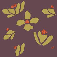 Eenvoudige semi-abstracte bloemmotieven in retro geïnspireerd kleurenpalet. Grafische collage van bloemvormen. Romantisch, Boheems, Retro, Eclectisch, Nieuw Landelijk, Scandinavische woonstijl.