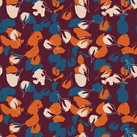 Moderne botanische kunst geïnspireerd door de Scandinavische natuur. Prachtige semi-abstracte bloemmotieven in een retro geïnspireerd kleurenpalet. Naadloze herhaling - kan worden gebruikt als behang of stof. Grafische collage van bloemknoppen, vormen en bladeren. Romantisch, Boheems, Retro, Eclectisch, Nieuw Landelijk, Scandinavische…