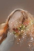 Een romantisch, abstract schilderij van een bloemenmeisje in de warme kleuren taupe, beige, oranje en wit. Dit minimalistische portret past ontzettend goed in een strak, modern interieur, maar ook in het romantische interieur zal zijn zeer goed tot haar recht komen.