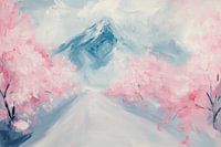 Een zachte landschapsdroom ontvouwt zich, waar tere kersenbloesems in felroze het koele blauw van de bergen omarmen. Het pad verdwijnt in de verte, terwijl hemelse wolken het landschap een dromerige lichtheid geven. Hier lijkt de natuur een harmonieuze dialoog te creëren tussen bloesem en piek die de ziel raakt.