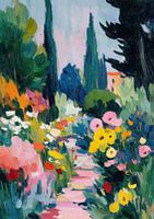 Een tuin vol bloemen met een pad op de voorgrond, aan weerszijden omzoomd door bomen en cipressen. Het kleurenpalet bestaat uit roze, groen, geel, blauw en paars. Het olieverfschilderij is geïnspireerd op de stijl van Henri Matisse, heeft een vintage uitstraling en is voorzien van krachtige, expressieve penseelstreken. De compositie…