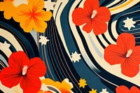 Kleurrijke hibiscusbloemen dansen tegen een dynamische, golvende achtergrond. De levendige rode en gele tinten brengen een levendige energie in de kamer. Deze bloemencompositie geeft de woonkamer een ontspannen vakantiesfeer en zorgt voor een frisse noot, ideaal voor een gezellig samenzijn.