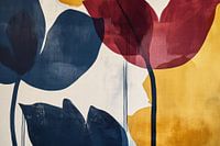 Zachte contouren in gedurfde kleuren smelten samen tot een harmonieus samenspel van bloemen die de kamer vullen met een vleugje elegantie. De zachte blauwtinten contrasteren levendig met warm rood en helder geel. Ideaal voor een woonkamer, het creëert een uitnodigende sfeer en nodigt uit om te blijven hangen.