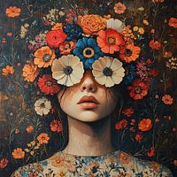 Bloemenportret | Kleurrijk Bloemenportret - Op dit bloem schilderij zie je een jonge vrouw wiens hoofd en schouders bedekt zijn met een levendige mix van kleurrijke bloemen, waarbij de textuur en de details van de bloemen een realistische en natuurlijke indruk geven.