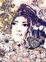 In het middelpunt van dit meesterwerk staat de abstracte representatie van een gezicht met vrouwelijke contouren, omringd door een overvloed aan bloemen. De abstracte stijl geeft een mysterieus en tegelijkertijd levendig karakter aan het beeld. Elk element in het beeld lijkt de vitaliteit en schoonheid van de natuur te omarmen, terwijl de vrouwelijke essentie een vleugje elegantie toevoegt.