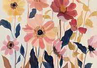 Bloemenpracht | Bloom Glow - Dit bloemen schilderij toont een levendige verzameling van grote, opvallende bloemen in tinten roze, geel en dieppaars, met gouden accenten op een lichte achtergrond.