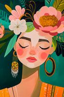 De afbeelding toont een gestileerde vrouw met gesloten ogen, omringd door weelderige bloemen en bladeren. Opvallend zijn de levendige kleuren, de grote, ronde oorbellen en de delicate sproeten op haar gezicht. De zachte jukbeenderen en ontspannen uitdrukking brengen een sfeer van vrede en innerlijke harmonie over.