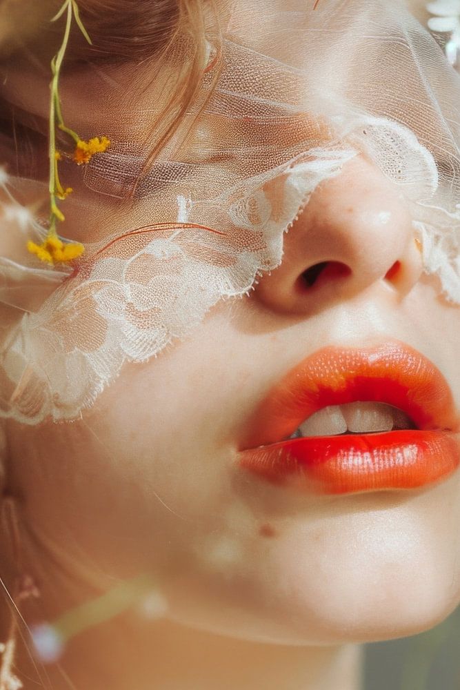 De foto toont een fascinerend portret van een vrouw wier ogen bedekt zijn met delicaat kant en bloemen. Haar felrode lippenstift valt indrukwekkend op en harmonieert met de gebloemde hoofdtooi. De zachte kleuren van de bloemen en de speelse details geven het tafereel een dromerige en mystieke sfeer.